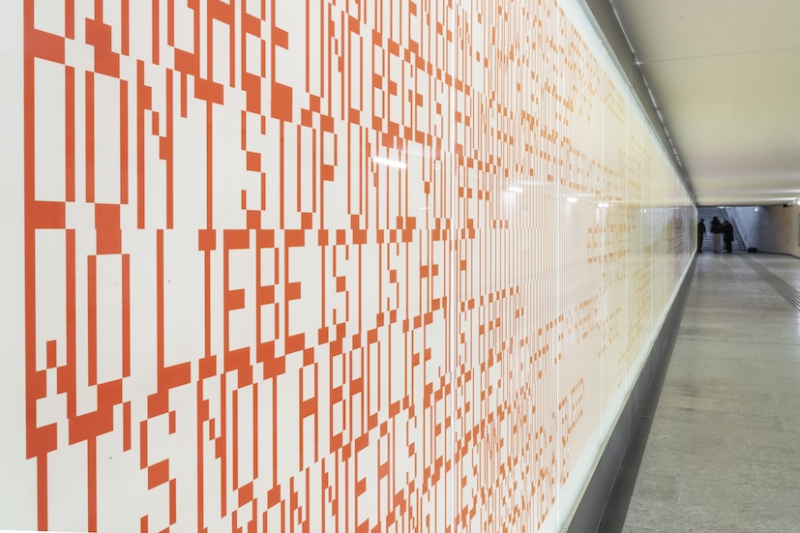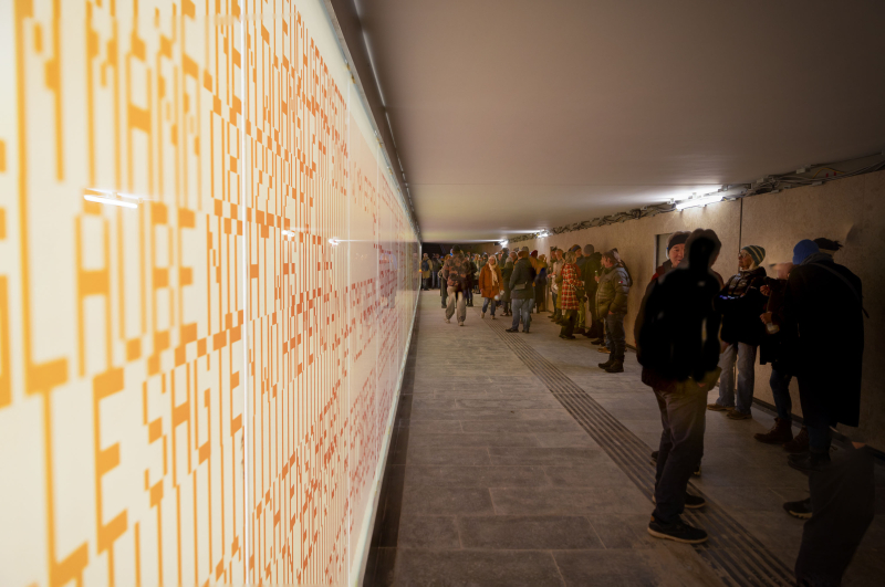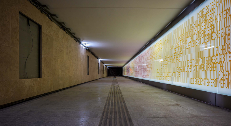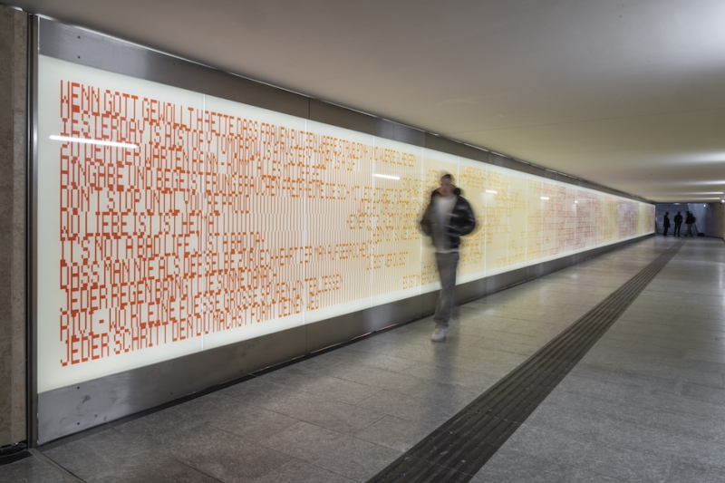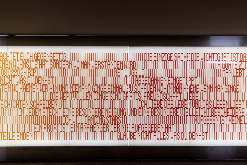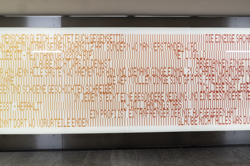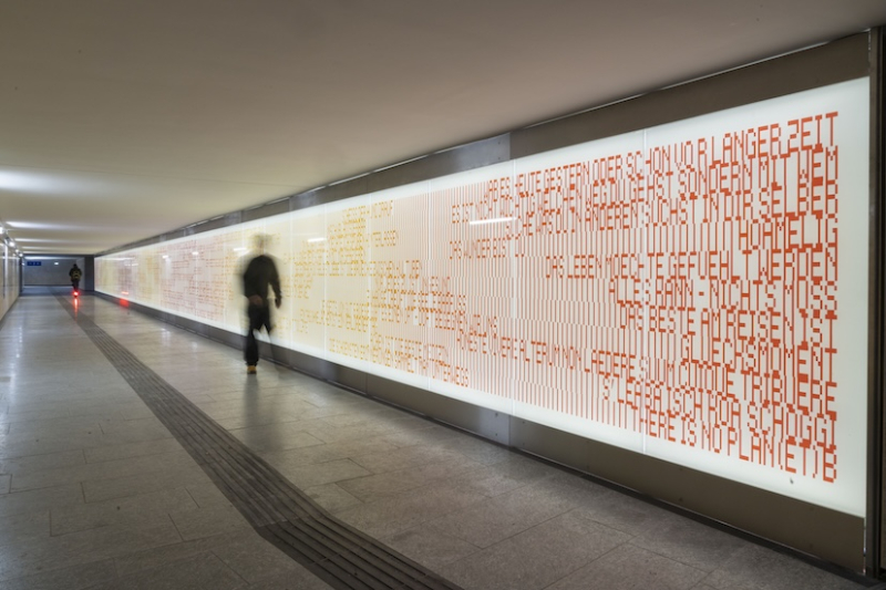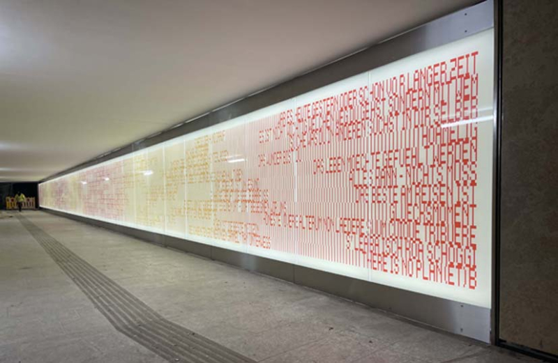 Aus diesen Stimmen entwickelte Marbod Fritsch die Arbeit. Die Sätze wurden in einer Teletext-ähnlichen Typografie gestaltet und als hinterleuchtete Glaswand in die Unterführung integriert.